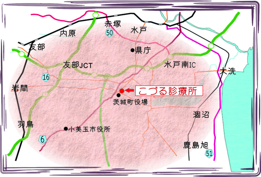 茨城県 水戸市 (南部)、茨城町、鉾田市、小美玉市(旧、友部町、内原町、岩間町、美野里町、鉾田町、旭村)近郊で在宅医療、訪問看護、緩和ケア(在宅ホスピス)がおよその対応エリアです。